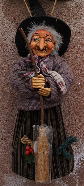 La Befana is a figure from Italian folklore. Artwork and written accounts depict her as an elderly woman who rides a broomstick and carries a sack of candy to deliver to children. She enters children’s homes by shimmying down the chimney on Epiphany Eve. Like Santa Claus, her gift-giving is based on a naughty-or-nice list. The well-behaved children receive candy or a toy, and the misbehaving children receive coal, onions, or garlic.